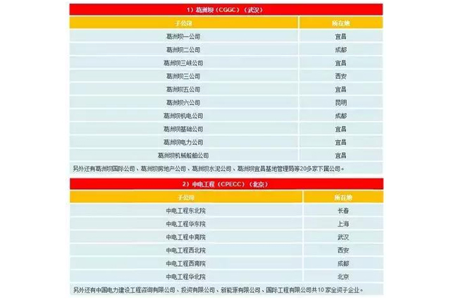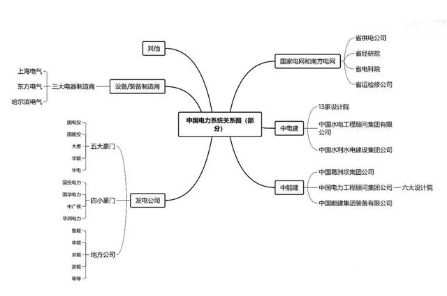 ►四家辅业集团:中国电力工程顾问集团(下属六大区域设计院)、中国水电工程顾问有限公司、中国水利水电建设集团公司、中国葛洲坝集团公司。
