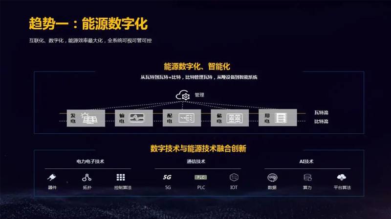 互联化、数字化让能源效率最大化,全系统可视可管可控。从瓦特到瓦特+比特,比特管理瓦特,从哑设备到智能系统。数字技术与能源技术实现融合创新:电力电子技术(器件、拓扑、控制算法)、通信技术(5G、PLC、IOT)、AI技术(数据、算力、平台算法)。