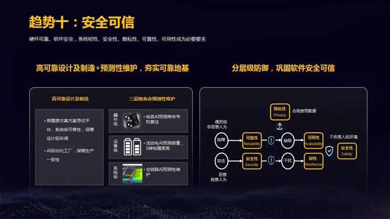 硬件可靠、软件安全,系统韧性、安全性、隐私性、可靠性、可用性成为必要要求。高可靠设计及制造+预测性维护,夯实可靠地基。分层级防御,巩固软件安全可信。