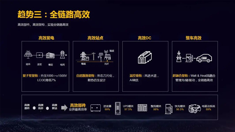高效部件、高效架构,实现全链路高效。高效发电,双子星架构(组件、逆变、箱变、电网),升压到±1500V,LCOE降低7%。高效站点,自然散热架构,形成刀片化,散热仿生设计。高效DC,温控重构,风进水退,AI调优。整车高效,超融合架构,Watt & Heat流融合管理充/储/驱动,全链路高效。高效器件、高效拓扑、高效算法实现高效部件。华为的部件领先业界,逆变器99%、UPS模块97.5%、整流模块98%、快充模块96.5%、电驱动系统89%。