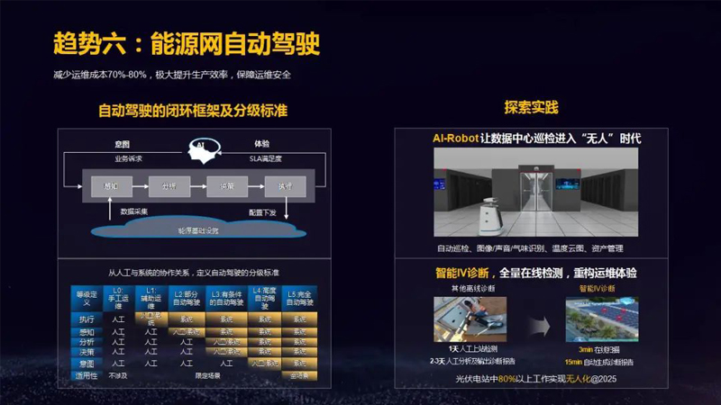 能源网自动驾驶可减少运维成本70%-80%,极大提升生产效率,保障运维安全。AI-Robot 让数据中心巡检进入“无人”时代,自动巡检、图像/声音/气味识别、温度云图、资产管理。智能IV诊断,全量在线检测,重构运维体验,光伏电站中80%以上工作在2025年可望实现无人化。