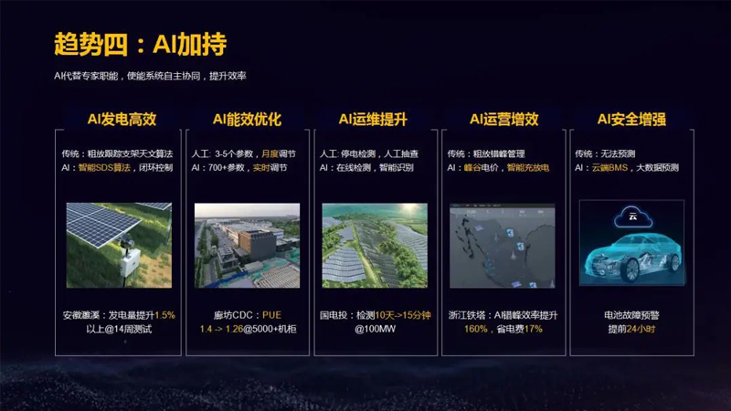 AI代替专家职能,使能系统自主协同,提升效率。AI发电高效:传统是粗放跟踪支架天文算法,AI的智能SDS算法,实现闭环控制,14周测试在安徽濉溪发电量提升1.5%以上。AI能效优化在廊坊的5000+机柜CDC实现PUE从1.4到1.26。AI运维提升实现在线检测,智能识别,在国电投100MW机组的应用效果好。AI运营增效,浙江铁塔AI错峰效率提升160%,省电费17%。AI安全增强,云端BMS,大数据预测,电池故障预警提前24小时。