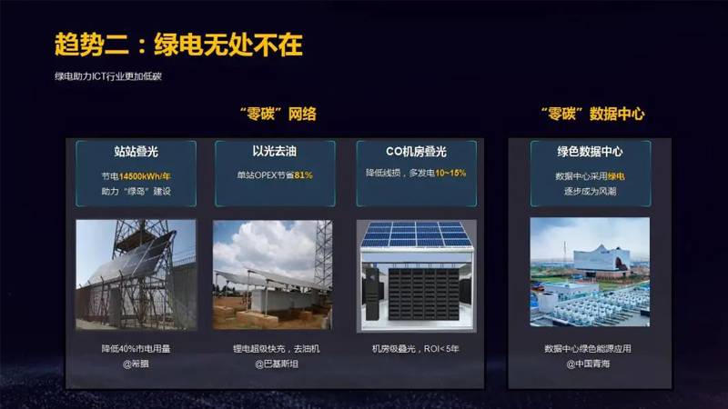 绿电助力ICT行业更加低碳。“零碳”网络:站站叠光,节电14500kWh/年,助力“绿岛”建设,在希腊降低40%市电用量;以光去油,单站OPEX节省81%,锂电超级快充,去油机;CO机房叠光,降低线损,多发电10~15%,机房级叠光,ROI< 5年;“零碳”数据中心,数据中心采用绿电逐步成为风潮,在中国青海的应用有代表性。