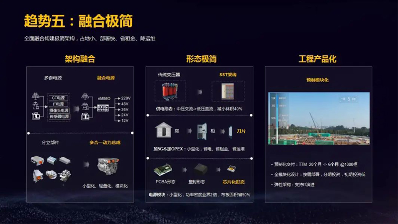 形态极简:传统变压器变成SST架构,供电形态从中压交流变成低压直流,可减小体积40%;从传统的房、柜变成刀片式,加5G不加OPEX,实现小型化,省电、省租金、省运维;