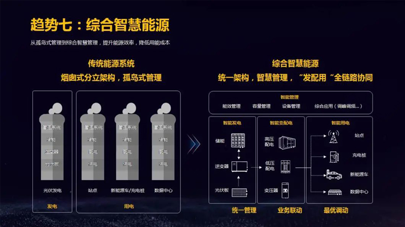 从孤岛式管理到综合智慧管理,提升能源效率,降低用能成本。传统能源系统,烟囱式分立架构,孤岛式管理。综合智慧能源系统,统一架构,智慧管理,“发配用“全链路协同。