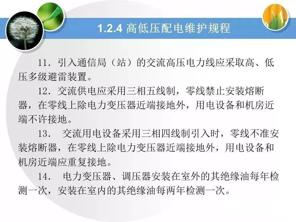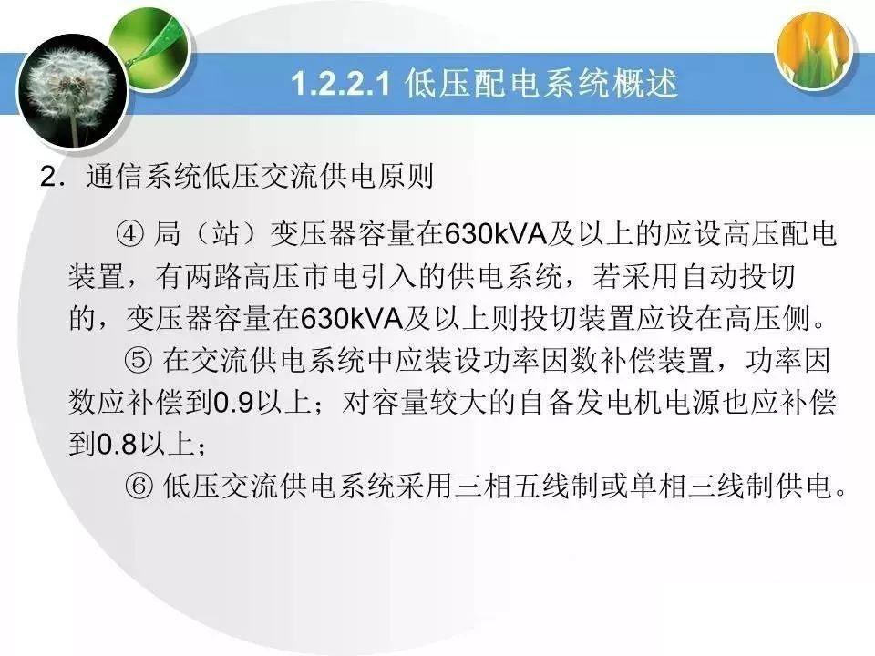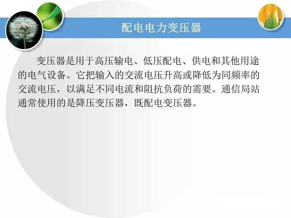 通信局站变电所可分为露天变电所和室内变电所两种,露天变电所又有杆架式(180KVA以下变压器)和落地式。室内变电所又有小型独立变电站和带有高压开关柜的变电所。一般有两路市电引入的变电所均采用带有高压开关柜的变电所。