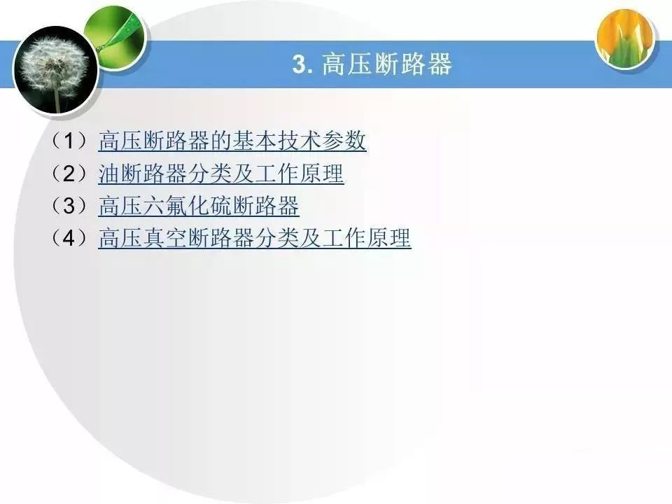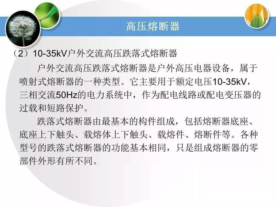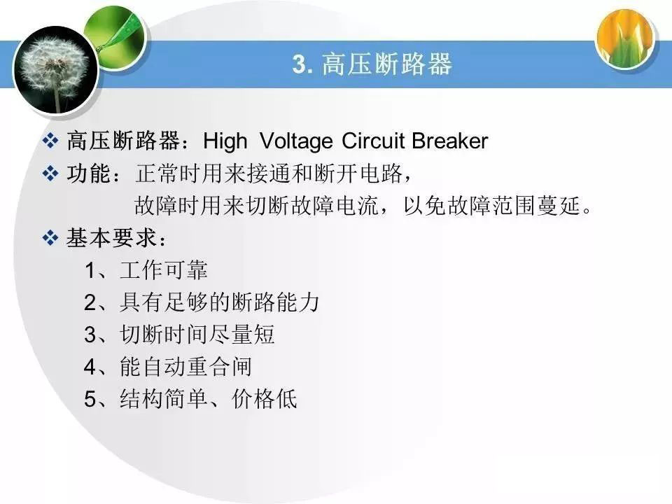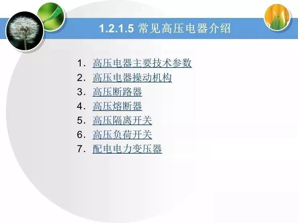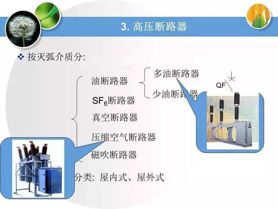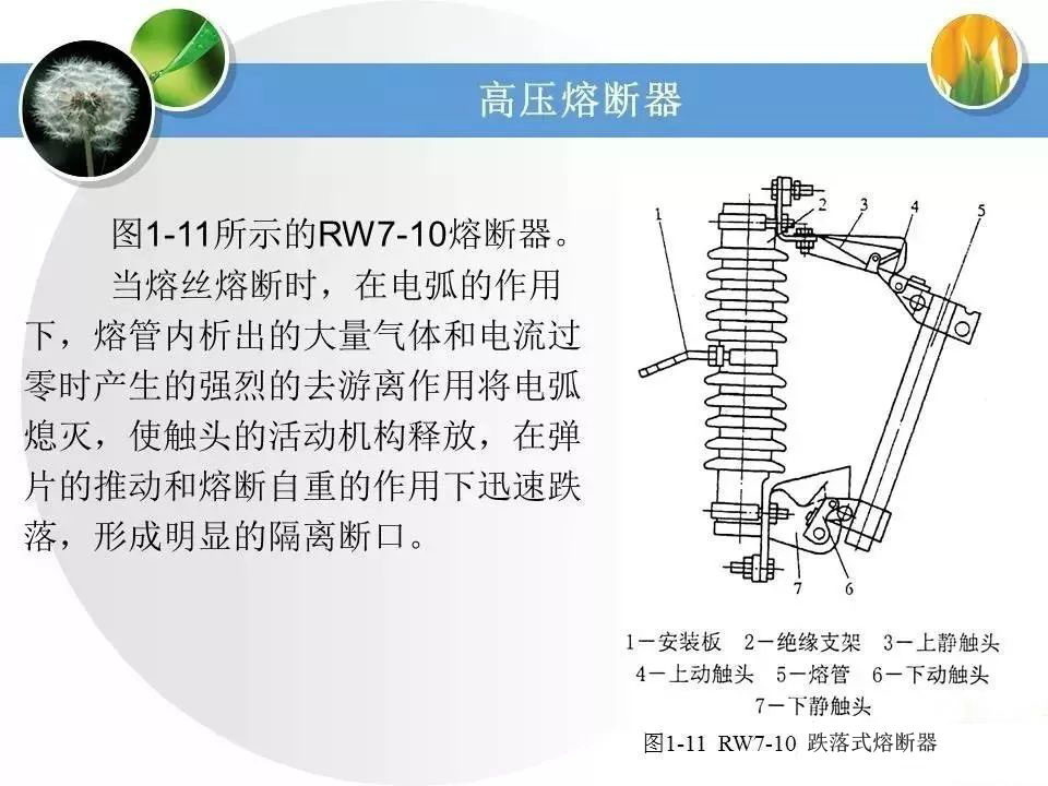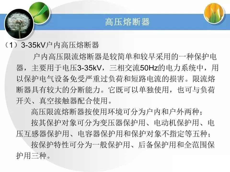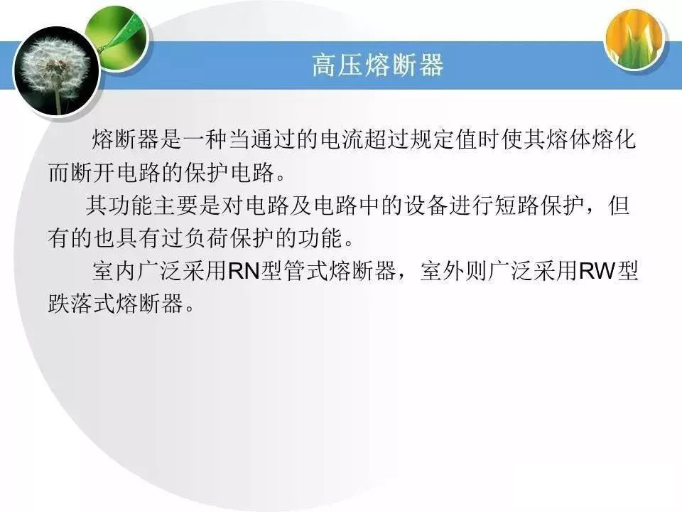 常用的高压电器:高压熔断器、高压断路器、高压隔离开关、高压负荷开关、避雷器等。