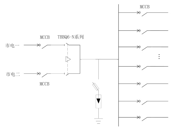 系统双路市电的切换推荐使用TBBQ3-N或TBBQ6-N系列带中性线重叠功能的双电源自动转换开关。