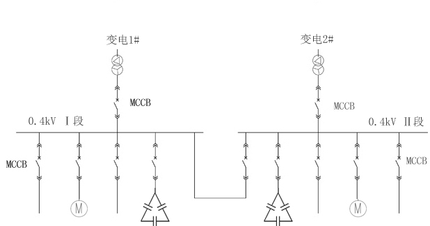 石化企业常用的低压配电系统,系统采用两进线一母联(单母线分断),此配电系统结构简单,用电可靠性高。