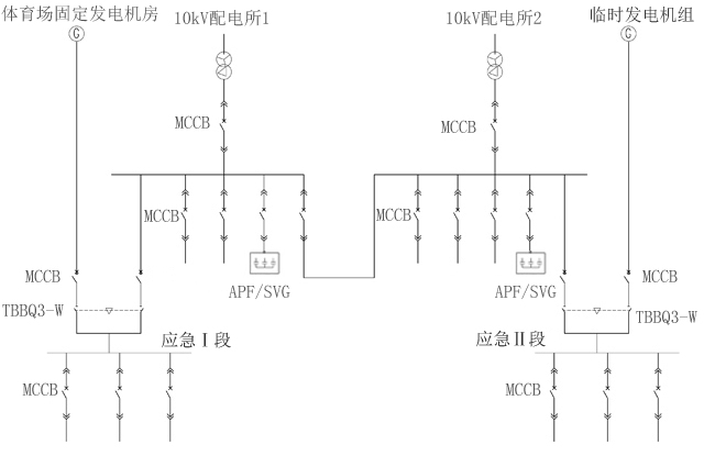 体育场馆用电负载如照明、UPS、空调、电梯等可采用BF-APF/SVG补偿装置,进行谐波治理,补偿解决三相不平衡问题;
